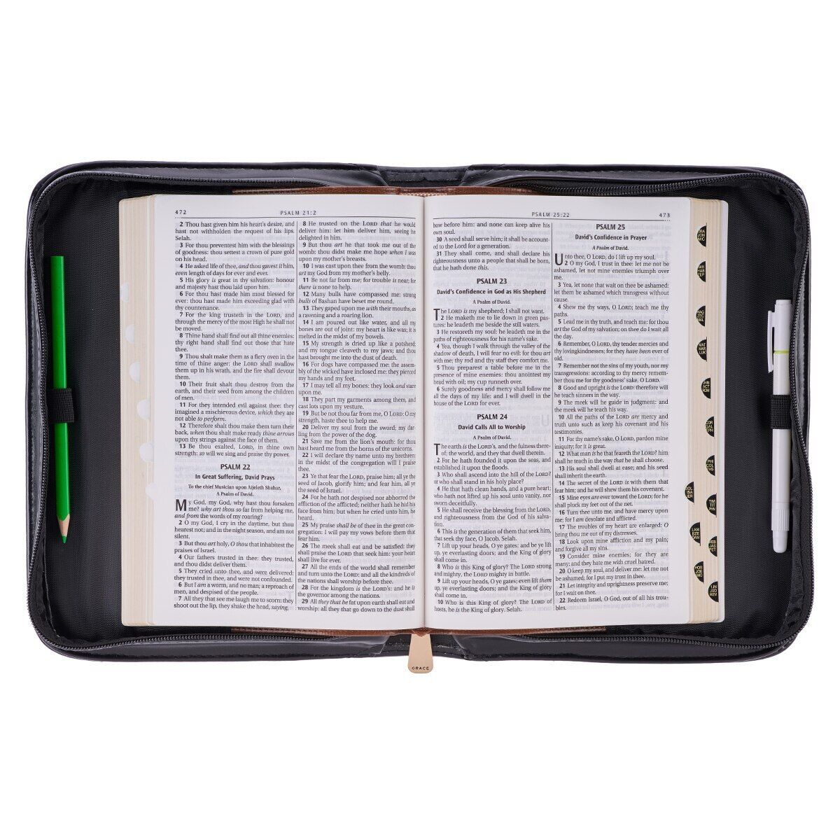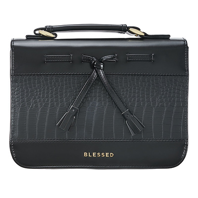 The Blessed Black Croc Faux Leather Fashion Bible Cover with Tassels is the perfect accessory to complement your tailored, classic style while protecting your Bible as you carry it along to church, Bible study, or anywhere you like to study the Word. Coordinating gold hardware attaches the faux leather lay-flat handle to the spine. A zipper with a smooth gliding zipper pull, also in gold, is engraved with a cross. A slip pocket on the back panel is a useful feature to keep notes and small notebooks. Inside the Bible cover are two pen loops that allow you to conveniently carry both a pen and a highlighter.