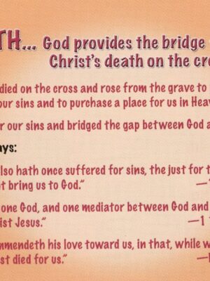 This small booklet style tract takes the reader through five different steps to salvation culminating in the Bridge of Jesus Christ as the only Bridge to reach God. Filled with Scriptures to explain the need for salvation this tract is excellent for sharing with everyone.
