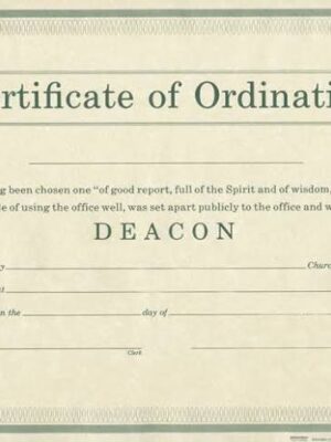 Flat certificates (8 1/2″ x 11″) for deacon ordination printed on beige parchment paper with green ink. Space for name, church, location, date, and signatures of Clerk and Pastor.