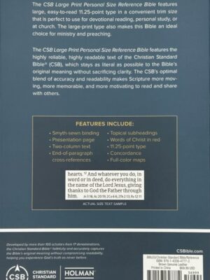 The CSB Giant Print Reference Bible features the highly reliable, highly readable text of the Christian Standard Bible (CSB), which stays as literal as possible to the Bible’s original meaning without sacrificing clarity. The CSB’s optimal blend of accuracy and readability makes Scriputre more moving, more memorable, and more motivating to read and share with others.