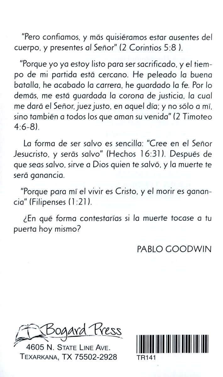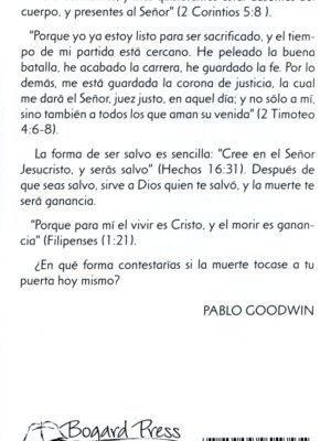 This bi-fold tract, written in Spanish, asks the simple question, what then? It is filled with Scriptures to show the reader that he, without Christ, will be condemned to hell. However, it also presents the Way, Jesus Christ, to the Father and eternal life. How would it be with you if death should ring your doorbell today?