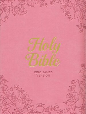 Heat-debossed flowers encircle the gold-foiled title and heat-debossed version reference on the front cover of this blossom pink faux leather Bible.