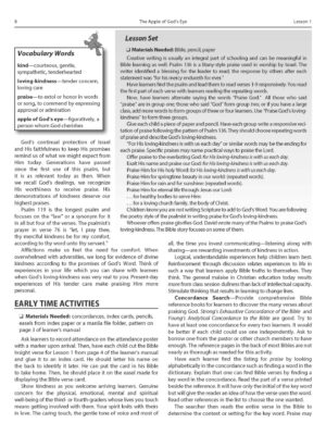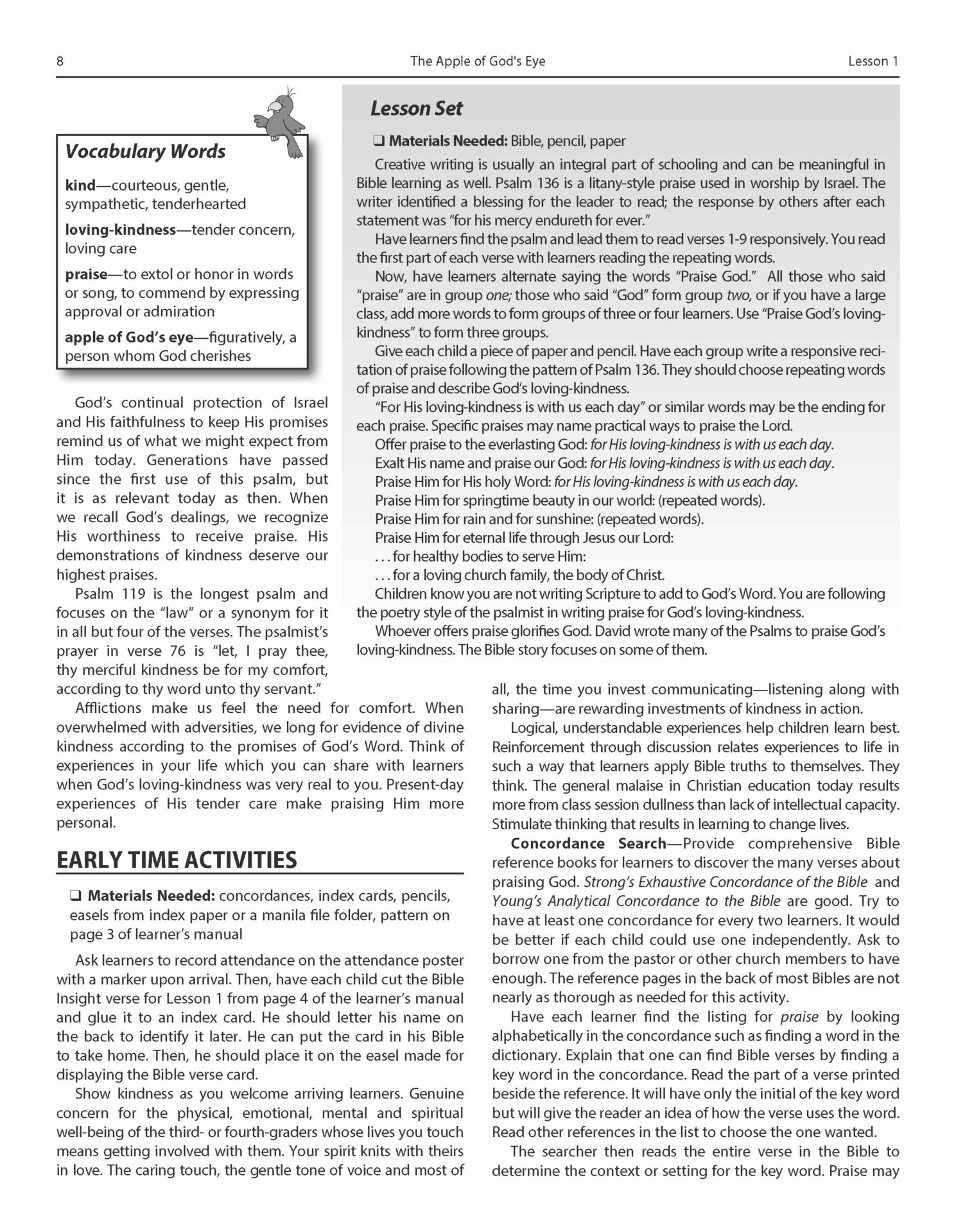 The Sunday School Bible Basics Primary Teacher’s Guide provides ideas for involving learners in each Sunday School class from the arrival of the first eager learner through the entire schedule. Every activity suggested relates to the lesson theme. Learning Bible verses by memory is easier with the active involvement ideas given in the Bible Insight section of each unit. Third- and fourth-grade children will enjoy spending time learning more about God with these lessons.