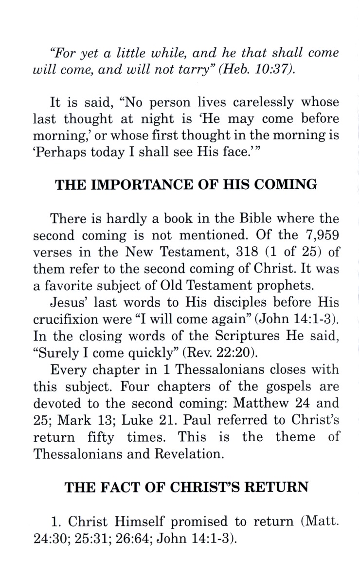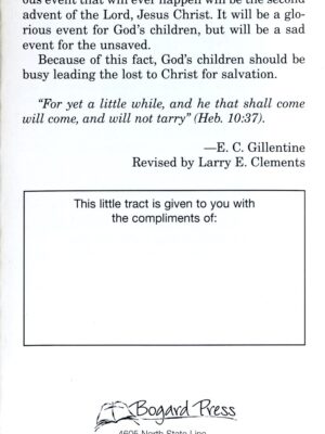This quad-fold tract examines the coming return of Christ for believers. E. C. Gillentine shows with the Scripture that Jesus is in fact returning and looks at some of the signs of His return. These signs are accomplished in the current generation, and as such, we must understand that His return is going to be soon!