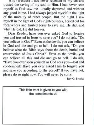 In What Does It Mean to Believe on the Lord Jesus Christ? Ray O. Brooks presents a challenge to the reader that requires a rethinking of one’s personal belief regarding Christ and His death, burial, and resurrection. Brooks asks not if the reader believes in God, in the same way the devils believe. Rather with this tract he asks if the reader has seen themselves as God sees them and placed their belief in Him.