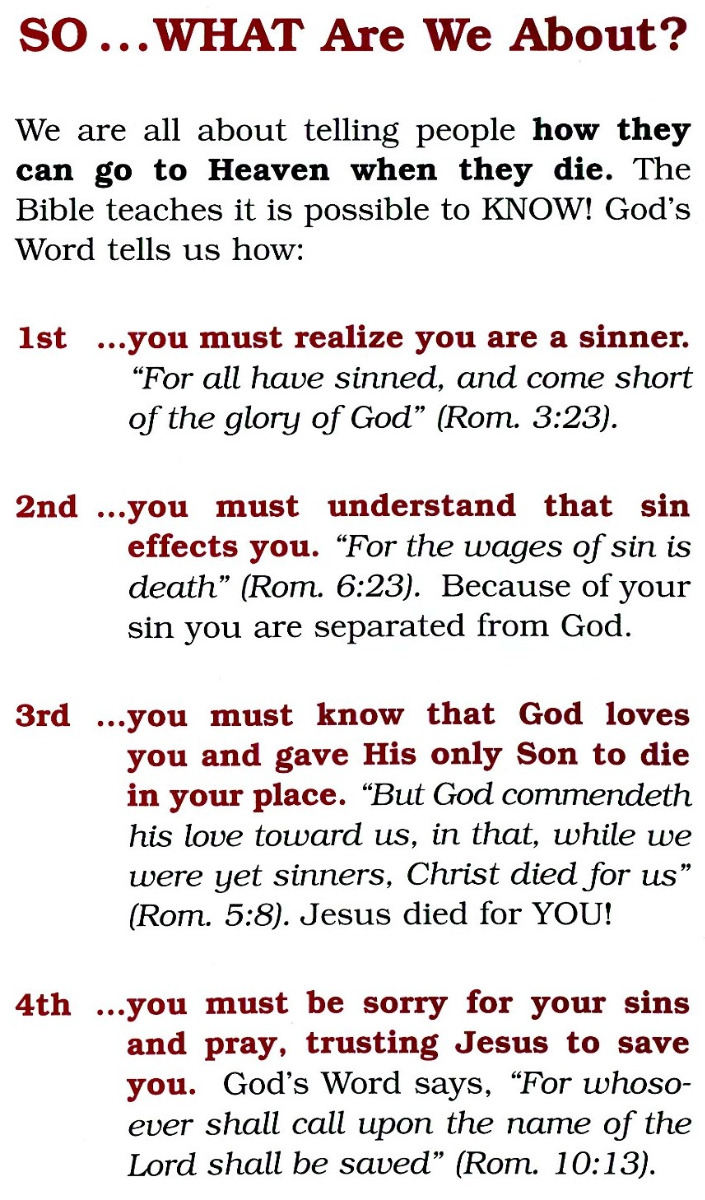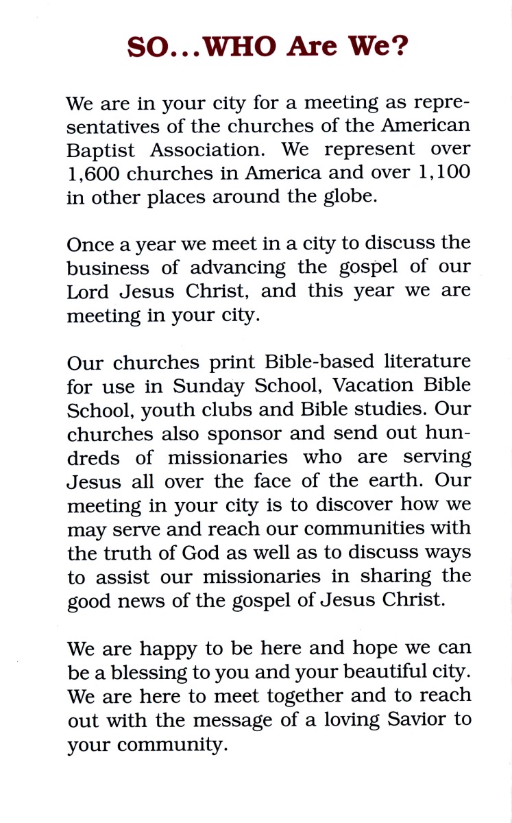 In answering the question, who are we, this tract helps the reader to identify the American Baptist Association and presents the gospel of Jesus Christ at the same time. An easy to share bi-fold tract to announce your presence in a city as well as share the gospel with readers.