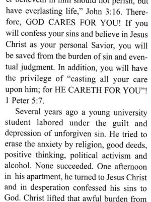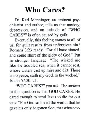H. L. Wilkinson, Jr. shows the reader that God cares for him in this simple tract asking the question Who Cares? This little tract is full of hope for all. It shows that not only did God care enough to send Christ, He also cares enough to take on our burdens today. Show those around you how much you care by sharing with them how much God cares.